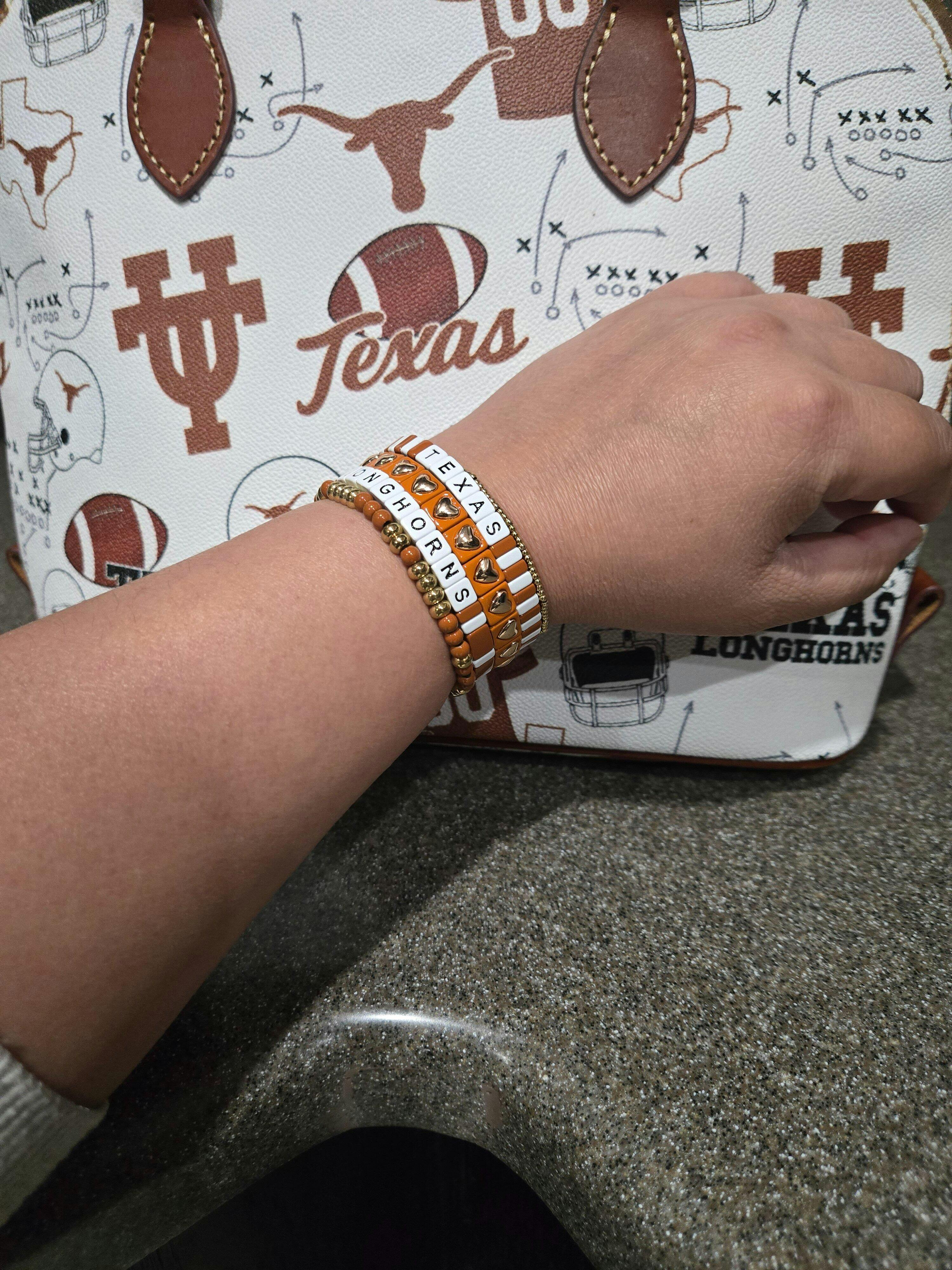 We offer the "TEXAS", "LONGHORNS", "HOOK EM" and "ALRIGHT" “ALRIGHT, ALRIGHT, ALRIGHT” enamel tile bracelets, each sold separately or buy a variety of duos or stacks.