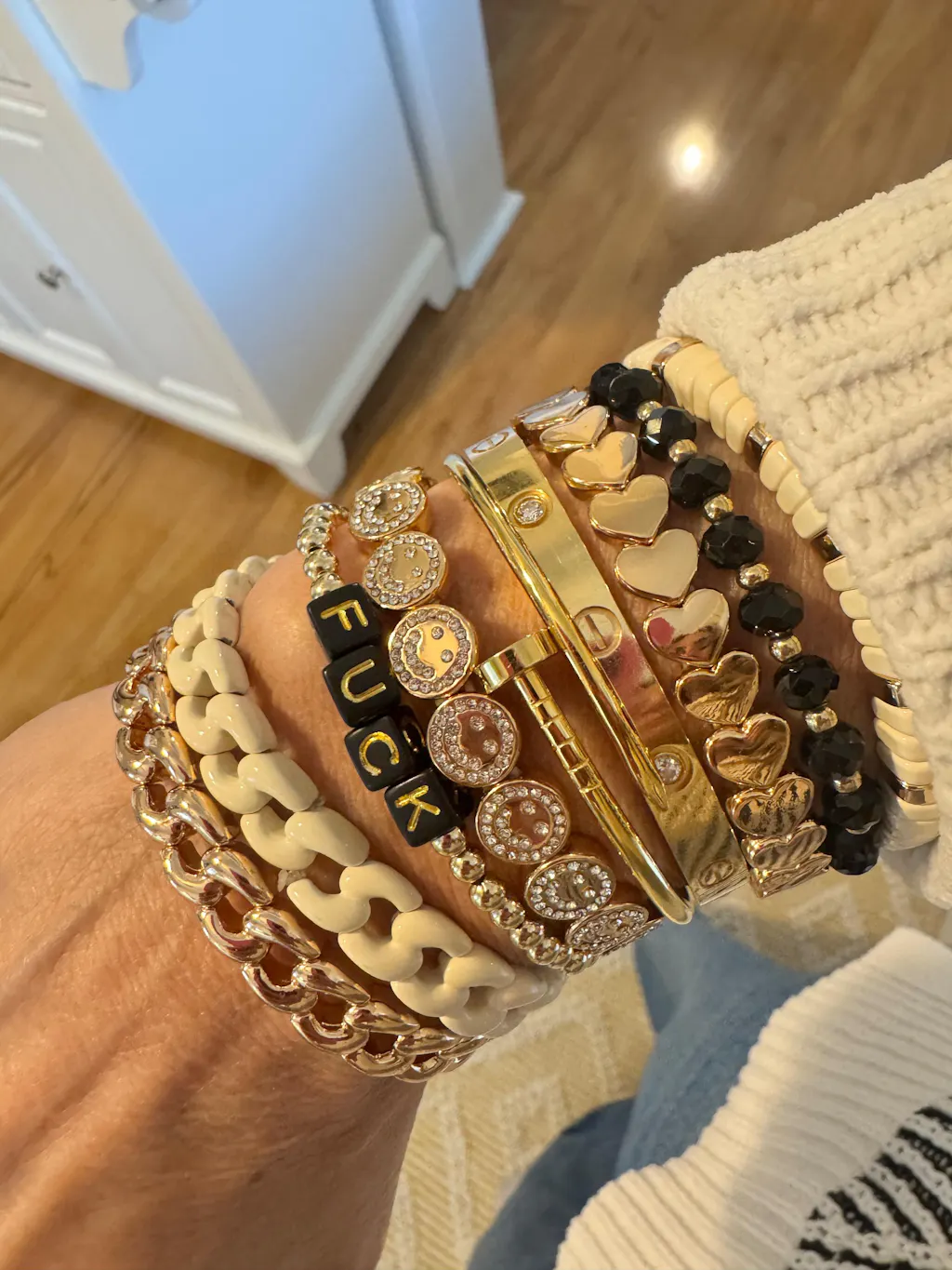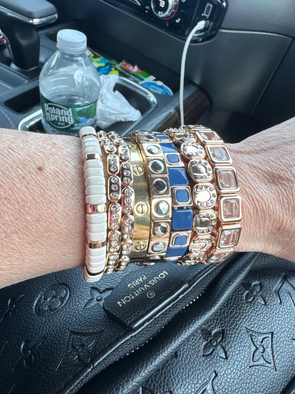 Stacking style suggestions - there really is no wrong way to stack our bracelets. Feel free to mix and match… Start with a core element in your outfit and build from there. Don’t forget to add a pop of color if you want to start a conversation or two, or keep it neutral for a more subdued aesthetic.