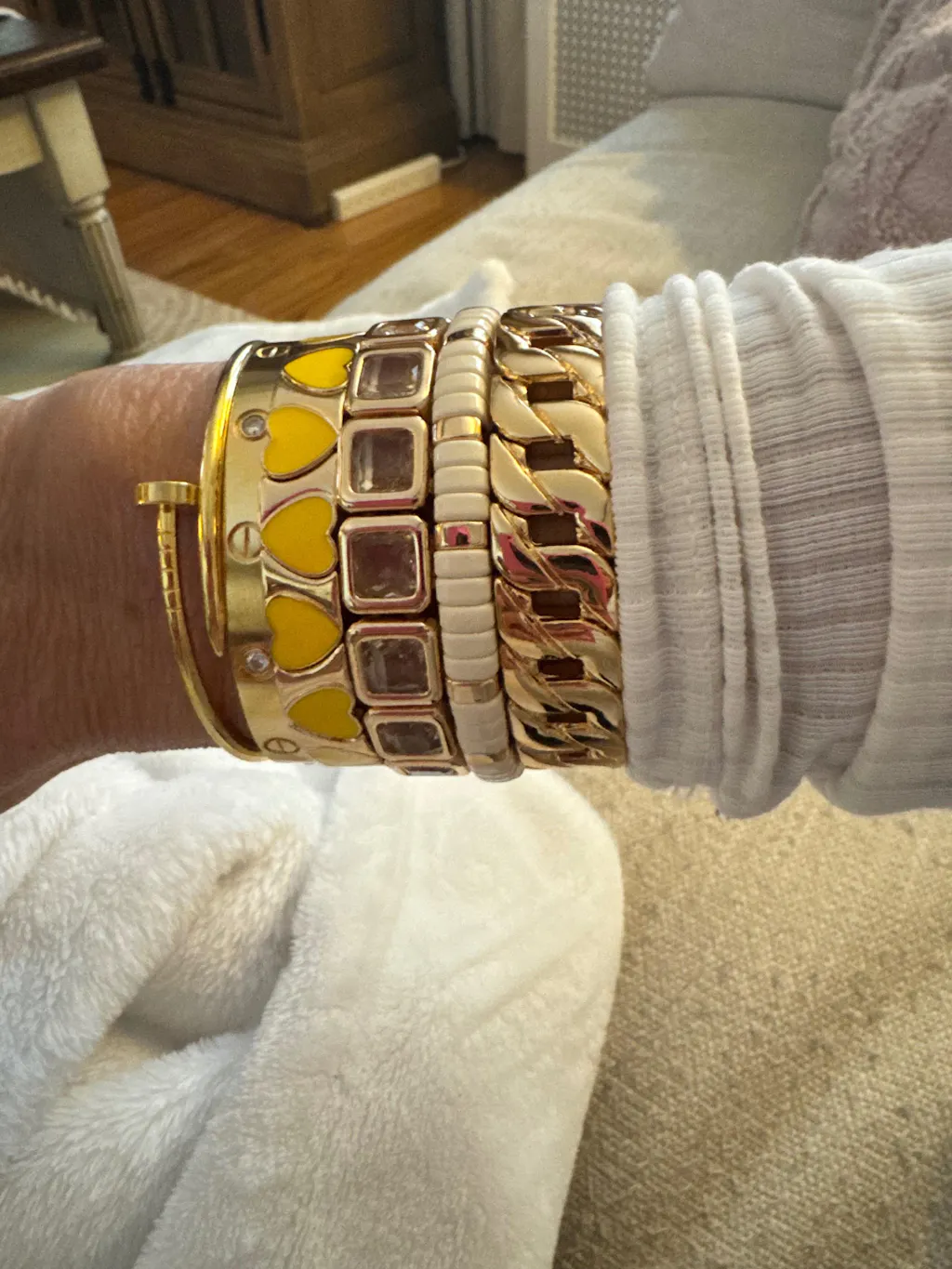 Our Chunky Gold Square Gems Bracelet consists of gold plated squares with a cz stone in the middle. The perfect statement to take you from day to night! Each bracelet is 7" in length and a slip-on-style. All of our single bracelets are designed to be stacked or they can be styled to wear alone.